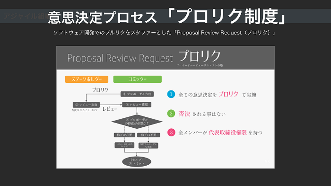 ソフトウェア開発におけるプルリク(プルリクエスト)機能にならい、主担当者が自分の企画や提案を全員が閲覧できるオープンな場所に公開し、全員からレビューをもらって修正や設計を行っていくのがゆめみ流プロリクだ。ゆめみではすべての意思決定をプロリクで実施し、全メンバーに代表取締役権限が委譲されている。また、提案が否決されることは基本的にないという。一見、危うい仕組みのように思えるが、ゆめみでは「自律」「分散」「協調」という3つの原理原則がプロリクの秩序を保っている。同社のディレクター兼プロデューサーである戸田修輔氏はこう話す。