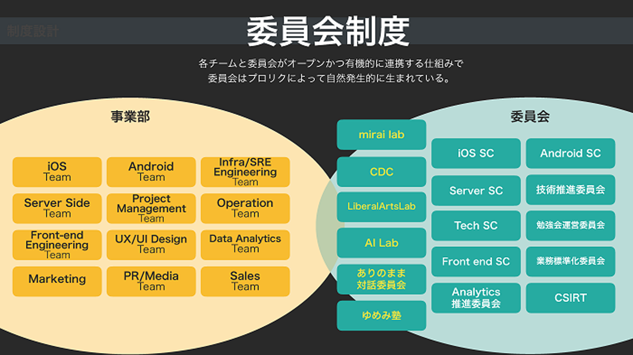 プロリクを通して誕生した制度のひとつが「委員会制度」だ。既存の事業部と対になる形で委員会が存在し、具体的な技術に関連する業務直結型の委員会もあれば、職能に関わらず多様な人が集まって業務上のコミュニケーションを補う委員会もある。本セッションでは、後者を代表して3つの委員会より、その立ち上げに携わった3名のメンバーが登壇。委員会の具体的な活動内容を紹介した。