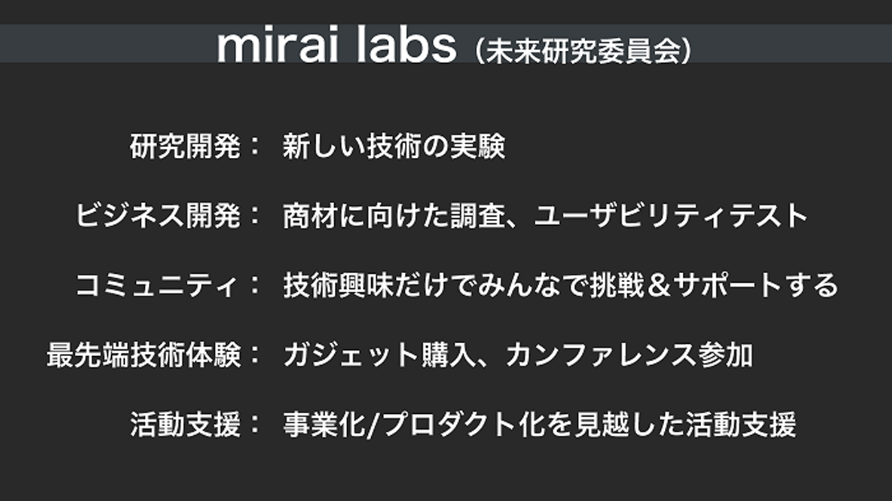 ふたつめの委員会は「mirai labs」だ。未来に向けた研究開発とビジネス開発を目的とし、最先端技術の研究や実験の場となっている。