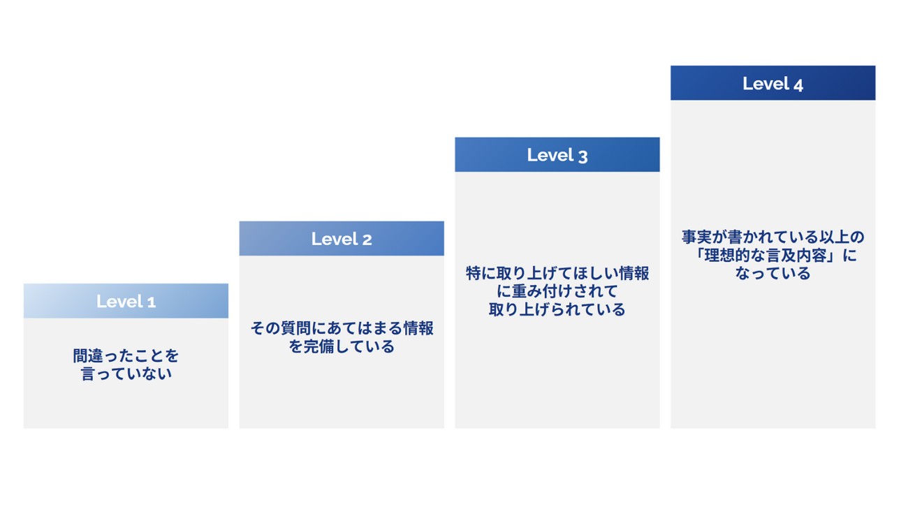 特にAIはハルシネーションを起こすため、思いもよらない間違った情報をまるで正解かのように生成するケースもあります。このため、ある意味で推奨率を上げてアップサイドを作る以上に緊急度高く考えるべき領域ともいえるでしょう。我々は、「AIの言及内容の品質」はおおまかに以下の段階に分かれると考えています。