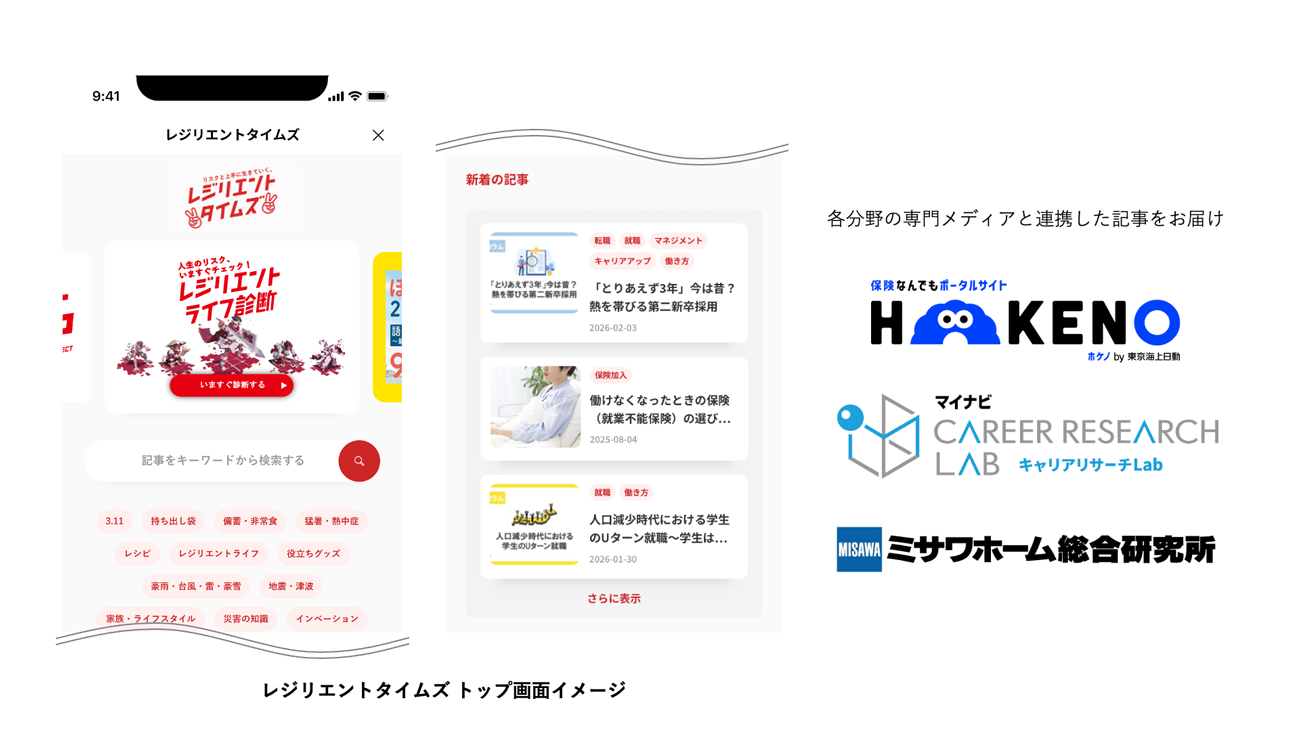 「レジリエントタイムズ」は、自然災害をはじめとする日常のさまざまな困難に対応する力(レジリエンス)を獲得するための情報プラットフォーム。自身のレジリエンス能力を診断・可視化できる機能も搭載されており、その診断結果をもとに、保険やキャリア、住宅などの必要な知識を専門メディアの記事と連携して提供する。