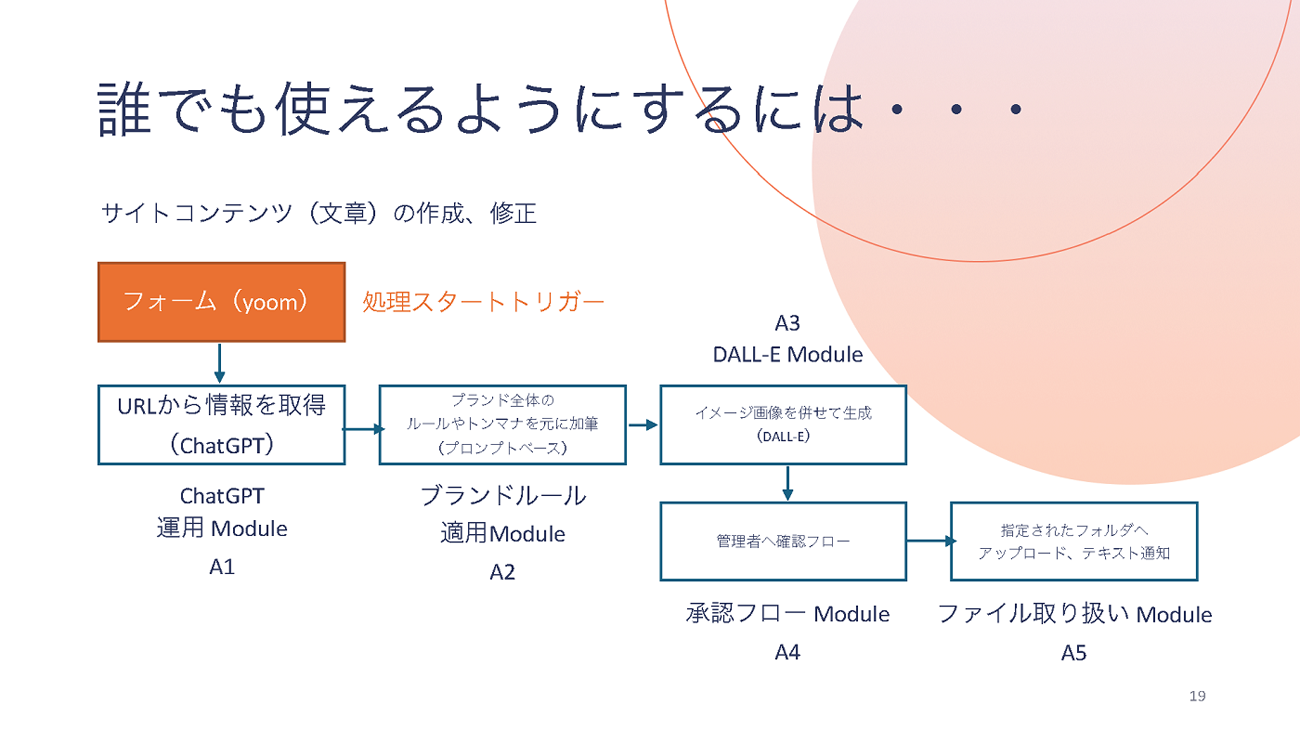 こうしたRPAツールを使う前提で、「自社のサイトコンテンツを作る」という業務を考えてみよう。サイトのテーマや自社の情報をChatGPTで取得し、トンマナのルールに合わせて文章を生成。イメージ画像も生成AIで制作し、管理者へ確認、指定のフォルダにアップロードする、といった流れだ。