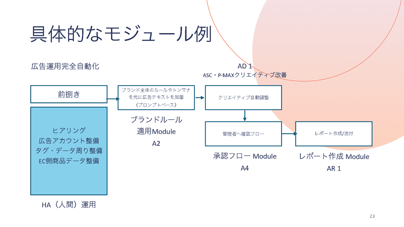 また、モジュール方式を使ったAI活用の別の例として取り上げたのは、広告運用の業務。「GoogleやMetaも、広告運用は完全自動化したほうが成果が高いと提唱している」と河野氏は語る。