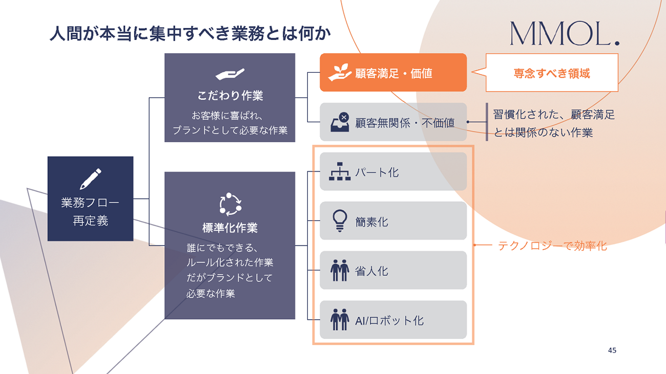 本来は、顧客の満足や価値を追求し、事業/プロダクトの戦略をつくっていくのがビジネスである。だからこそ、「無理に人を増やすのではなく、標準化できる作業はAIに代替して、顧客に届ける価値に集中するべきだ」と河野氏は指摘した。