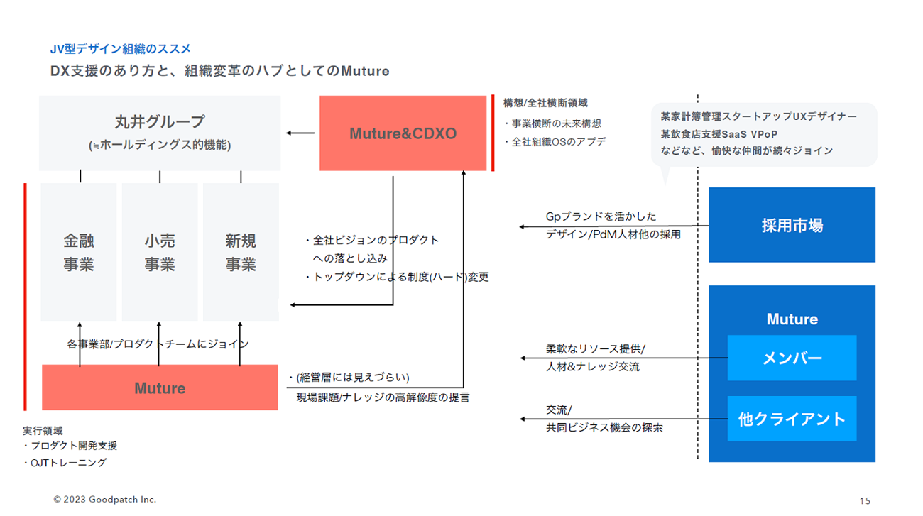 それだけでなく「Muture」という看板はデザイナーやPM人材の採用にも活きており、採用市場との接点にもなっている。さらに、グッドパッチの顧客である企業とのシナジーも生まれており、ともにビジネスを行おうとする動きも出てきているという。