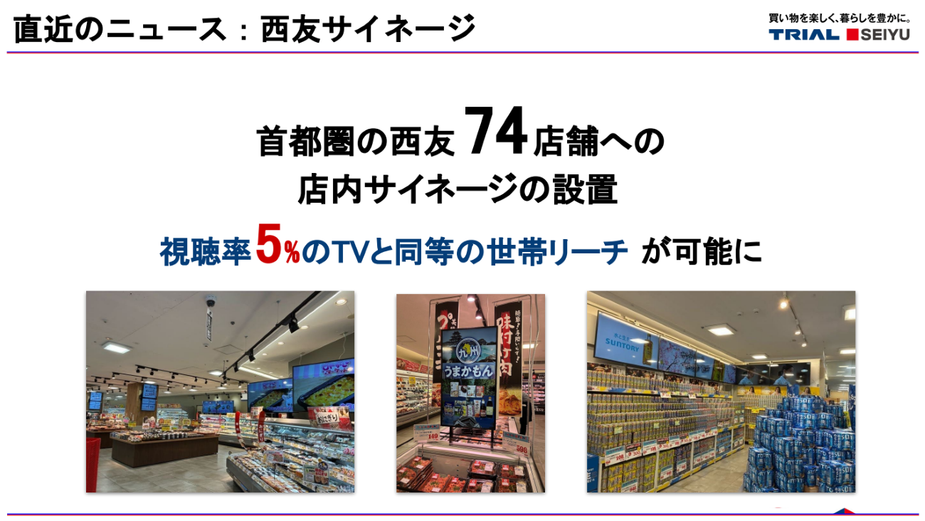 トライアルでは直近、首都圏の西友 74店舗に店内サイネージを“爆速”で設置中だ。視聴率5%相当の世帯リーチを見込み、購買効果で既存メディアを凌駕する、新たな巨大メディアが売り場起点で生まれ始めている。
