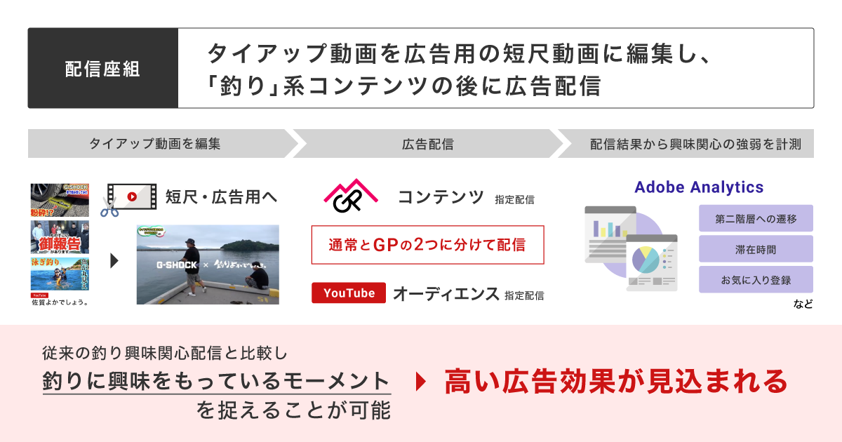 そこで私たちが打ち出したのが、釣りコンテンツを「今、この瞬間(モーメント)」に視聴しているユーザーへダイレクトに届ける広告配信です。フリークアウトグループのアセットである「GP YouTube Contextual Targeting(以下、「GP」)」を活用して実現しました。