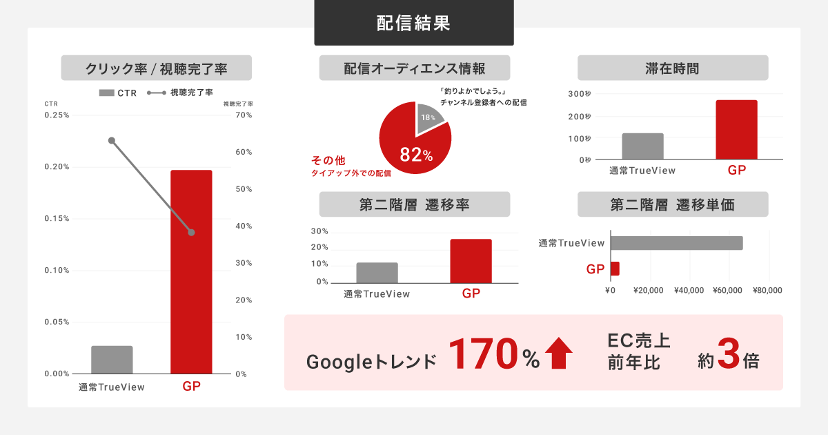 また今回、「『釣りよか』ファンダム以外にも届けること」が広告としてのミッションでしたが、結果は全リーチのうち82%が「釣りよか」登録者外。パフォーマンスの高さをキープしながら、ファンダム以外の「釣り」文脈のなかにいる膨大なターゲット層にリーチし、態度変容を促すことに成功したと言えるでしょう。