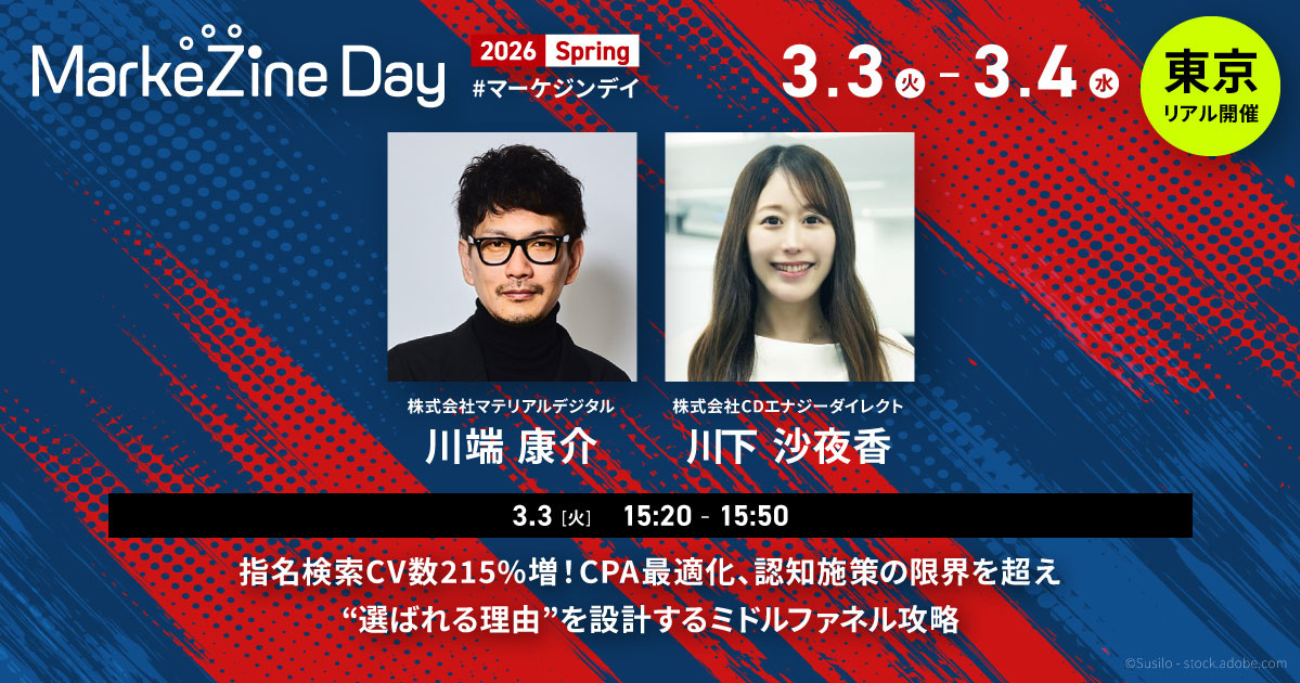 2つ目に紹介するセッション『指名検索CV数215%増!CPA最適化、認知施策の限界を超え“選ばれる理由”を設計するミドルファネル攻略』では、指名検索数215%の実績事例をもとに、“見える成果”だけに偏重せず“理解を積み上げる”ミドルファネル戦略の設計プロセスを、マテリアルデジタルが具体的に解説。総合エネルギー企業であるCDエナジーダイレクトも登壇し、“焼畑式マーケティング”から脱却して成果を持続的に積み上げるマーケティング構造への転換方法を学べるセッションとなっています。