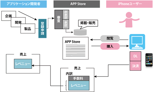 具体的に触れてみると…App Storeは、アプリケーションを企画・開発するサードパーティや個人開発者(以下、「アプリケーション開発者」と記載)とiPhoneユーザーで、かつアプリケーションをダウンロードしたいユーザーの橋渡しを行う…いわば、市場の役割をもっている。
