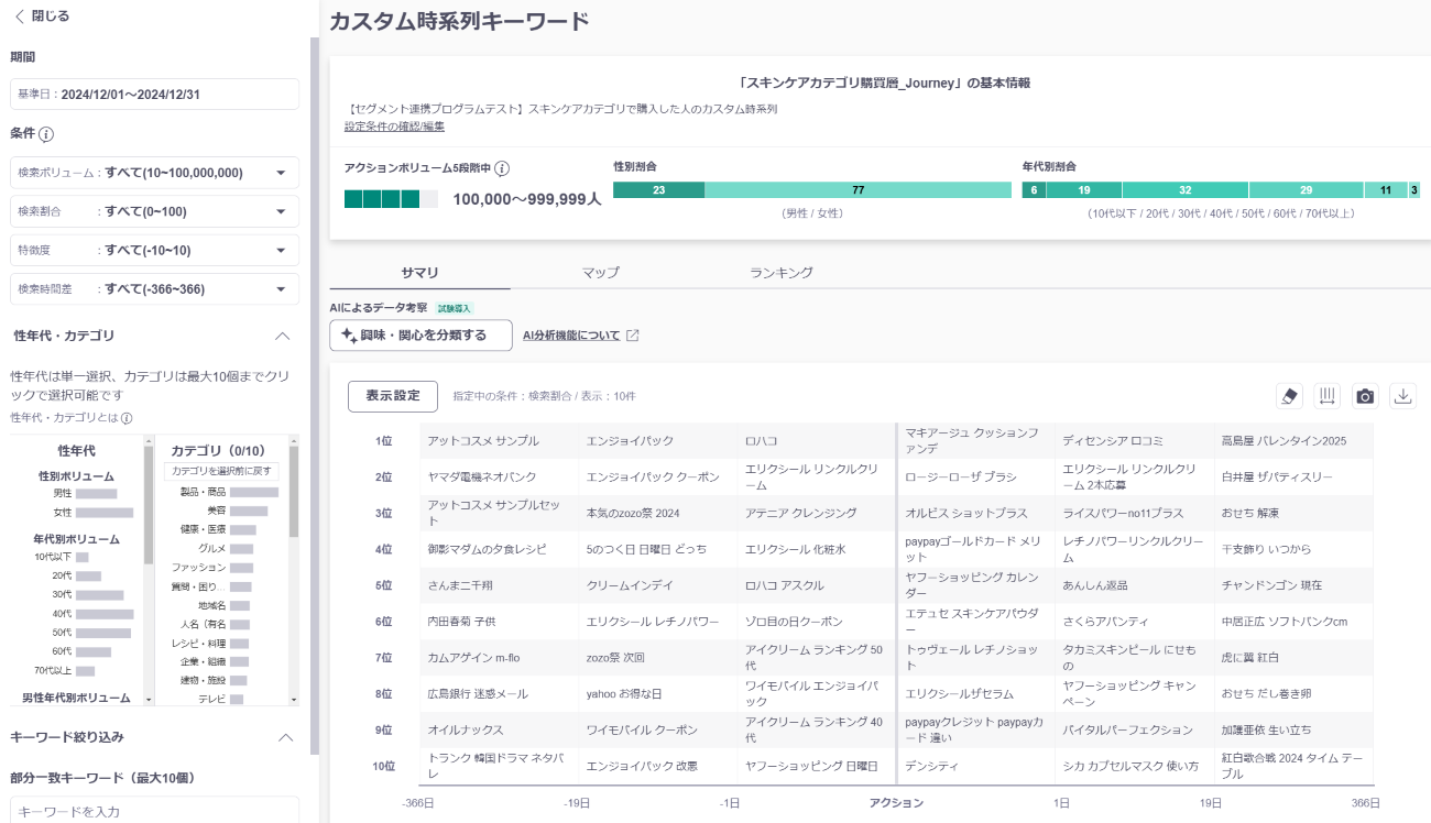 冨田:具体的には、特定の検索キーワードの前後に検索されているキーワードまで時系列を可視化する機能『Journey』と、先述のセグメント機能を組み合わせて使っています(「カスタム時系列キーワード」)。これにより、ユーザーが自社商品にたどり着くまでの検索内容が時系列でわかるだけでなく、自社商品と他社商品が認知されるタイミングや検索量の違いも把握できます。