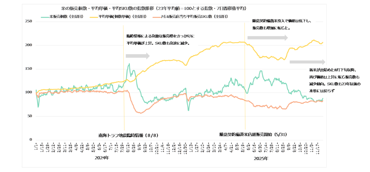 図表4は、2024年1月から2025年11月の約2年間における、全国の米の販売個数、平均単価(税抜)、米を販売した店舗1店あたりのSKU数の平均をそれぞれ指数化したものです。長期間の動向を構造的に捉えるため、日次データを週単位のトレンド(移動平均)として表示しています。