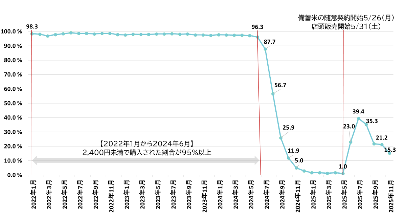2025年5月末から随意契約備蓄米の店頭販売が開始されると、翌6月には、2,400円未満で購入された割合が23.0%に上昇し、同7月は39.4%、同8月は35.3%と、1年前の2024年8月以来はじめて35%を超える水準まで回復しました。しかし、その後は随意契約備蓄米の販売が減り、同9月以降は21.2%以下と再び下落しました。