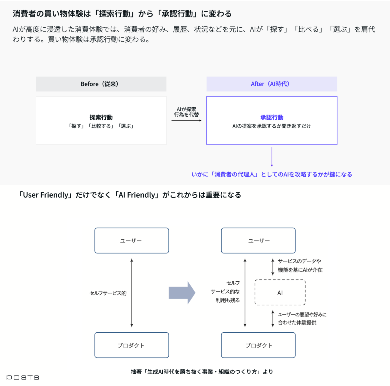 第1に「生活者の行動変化」への適応だ。梶谷氏は、生活者が自ら情報を探す「探索行動」から、AIの提案を受け入れる「承認行動」へと変遷していると指摘する。