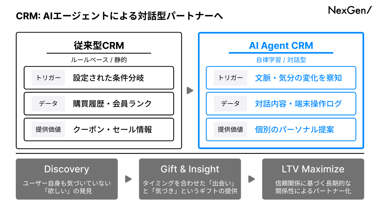 従来のCRMは、購買履歴や設定された条件分岐に基づく「ルールベース」の自動配信が主流だった。しかしこれからのCRMは、AIエージェントがユーザーの文脈や気分の変化を察知し、自律的に学習していく「対話型パートナー」へと進化する。