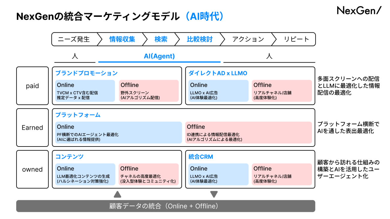 既に一部の小売業界などでは、アプリなどのオンラインIDとリアル店舗の体験をシームレスに連携させ、パーソナライズされた購買体験を提供する動きが進んでいる。AI時代の統合マーケティングにおいては、オンラインとオフラインの強みを明確に分け、融合させることが不可欠だ。