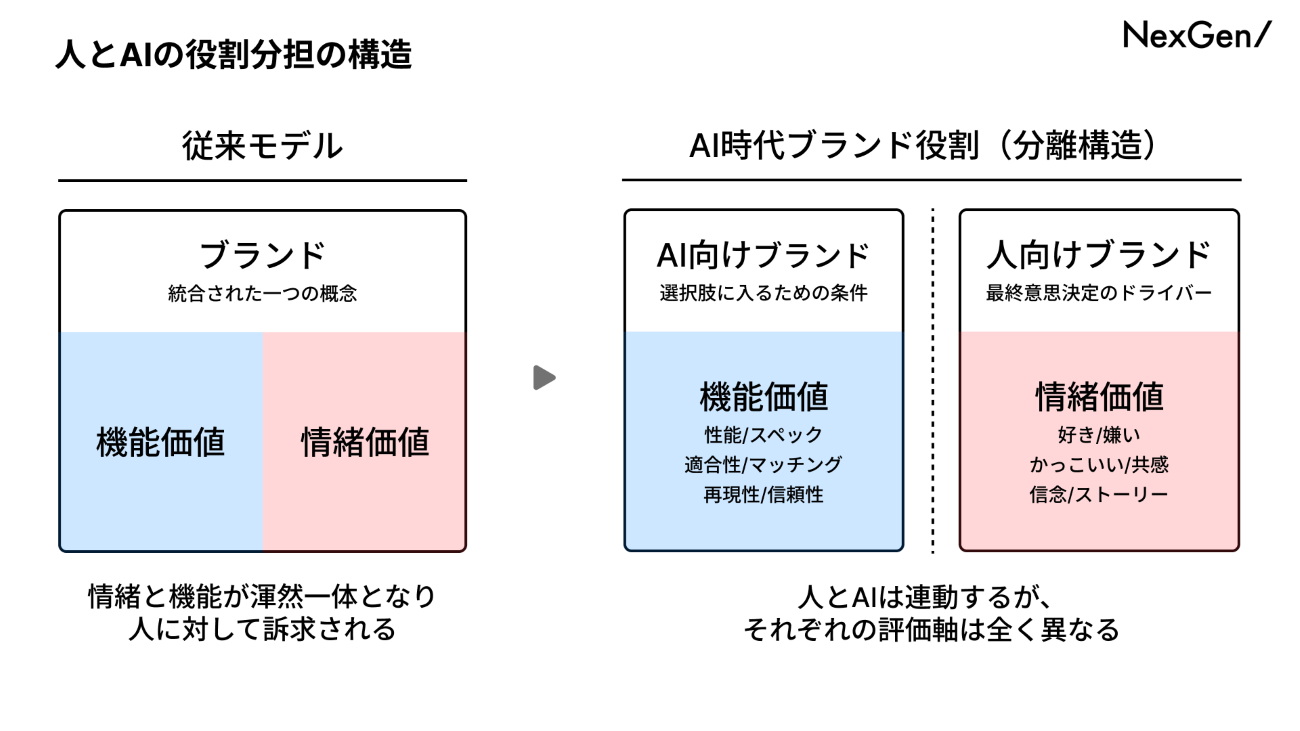 従来のマーケティングやブランディングは、商品のスペックなどの「機能価値」と、ブランドストーリーや共感などの「情緒価値」を混然一体として「人」に向けて訴求していればよかった。しかしAI時代においては、まず第一関門としてAIの合理的な評価フィルターを通過しなければ、そもそも消費者の選択肢にすら上がらなくなる。