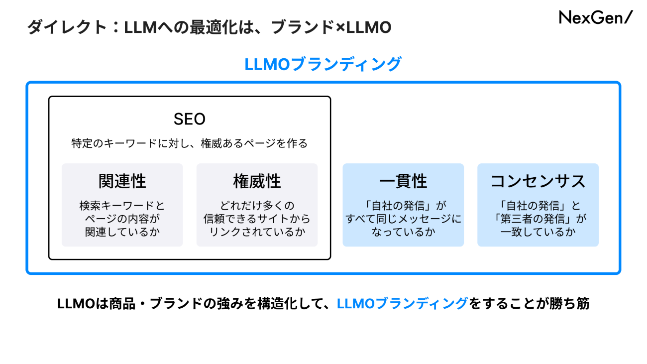 「SEOは検索されたキーワードに対して関連性や権威性を高めるゲームでした。しかしLLMOの場合は、AIが自律的に選びに来るため、選ばれるための『理屈』が必要です。その理屈こそが『ブランド』なのです。商品やブランドの強みを構造化し、LLMに正しく学習させる『LLMブランディング(ブランド×LLMO)』を行うことが、これからの勝ち筋になります」(金井氏)