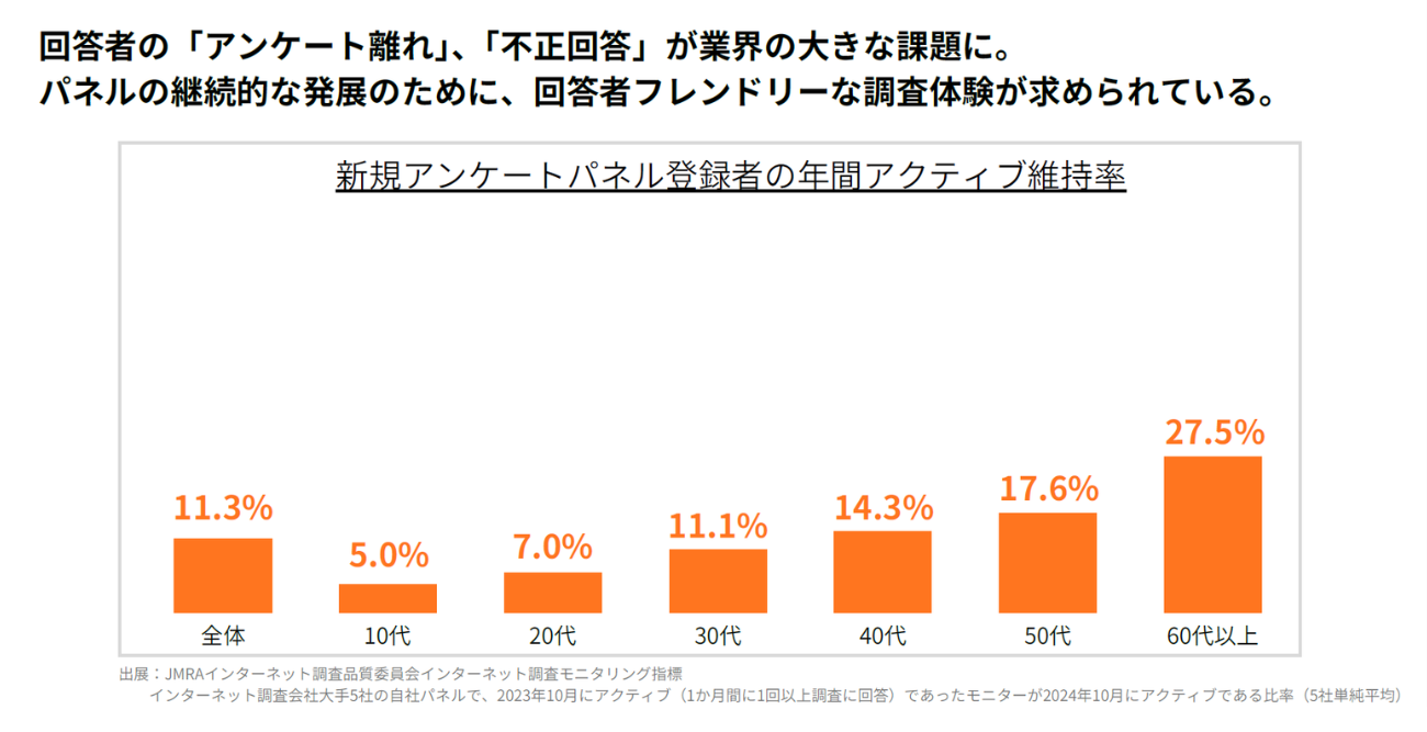 そして第3に、リサーチ業界の深刻な課題である「回答者の負荷軽減」だ。日本マーケティング・リサーチ協会(JMRA)の調査によると、新規アンケートパネル登録者が1年後もアクティブに活動している割合は、全体でわずか11.3%に過ぎない。特に若年層の離脱は顕著で、10代では5.0%、30代でも11.1%にとどまっている。