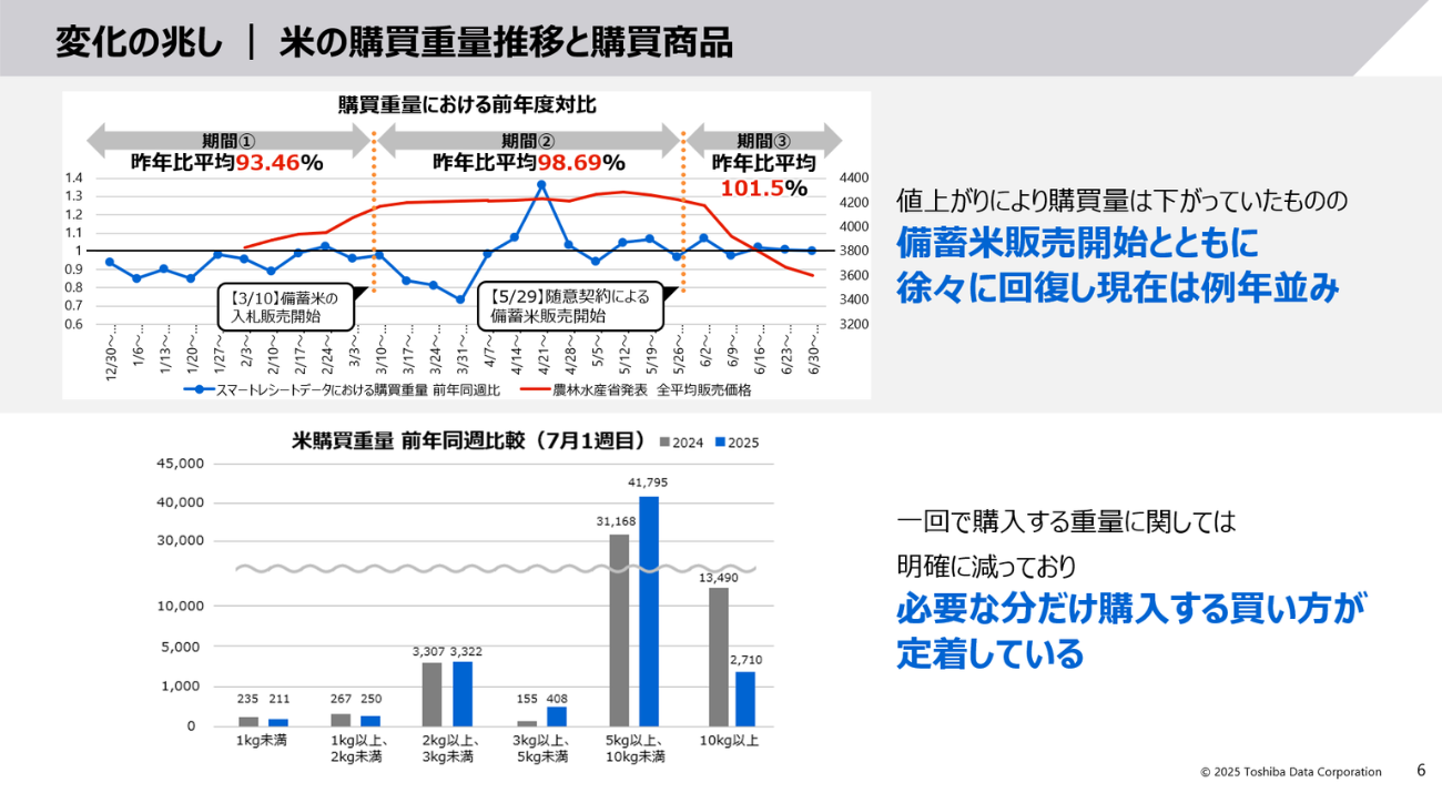 昨今の米の価格高騰によって「購買量が減少しているのではないか」と想像する人も多いだろう。しかし実際のデータを見ると、2024年の春ごろの備蓄米の販売開始とともに購買が回復し、例年通りの購買量となっている。このことから、消費者は米を価格や値ごろ感だけで買っているわけではないという事実が見えてくる。