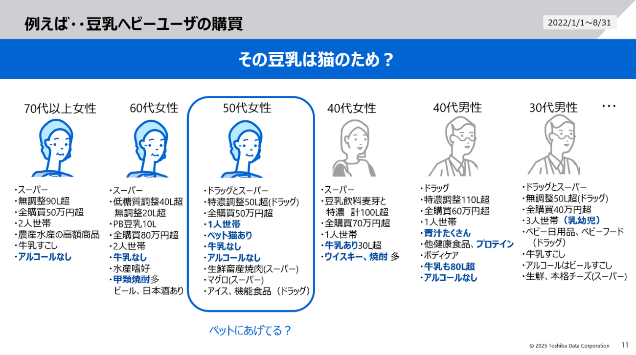 宮崎氏は、東芝デジタルソリューションズが分析を支援した、とある飲料メーカーのケースを例に挙げた。その企業が販売している豆乳のヘビーユーザーを分析したところ、豆乳を購入する際にペットフードを一緒に購入していることがわかったという。