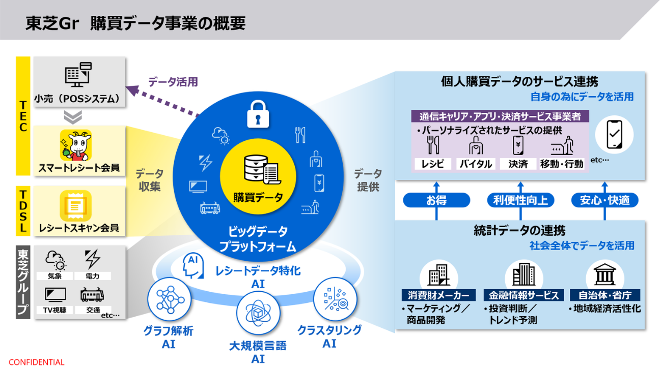 そんな中、東芝のスマートレシートとレシートスキャンを組み合わせたデータでは、One IDで会員の購買情報をトレースできる。レシートデータはそのままでは価値化が難しいため、同社の「レシートインフォマティクス」というAIを活用した技術を用いて、価値を向上しているという。