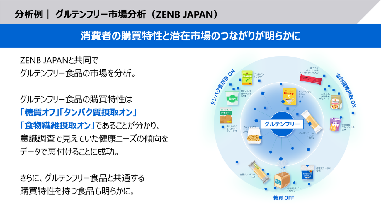 同社は、ZENB JAPANと共同でこのレシートインフォマティクスのソリューションを活用し、グルテンフリー食品の市場を分析。