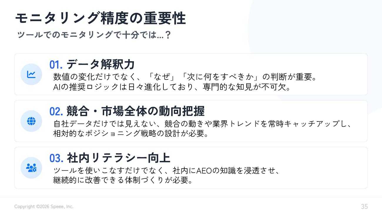 「このモニタリングにおいては、『データの解釈力』が非常に重要です。LLMのモデルアップデートは非常に激しいうえに、競合や市場の動向をすべて網羅できるツールはまだ存在しません。だからこそ、単にツールで数値を追うだけでなく、そこに『専門的な解釈』を加え、施策とモニタリングを一体で進めていくアプローチを推奨しています」(藤井氏)