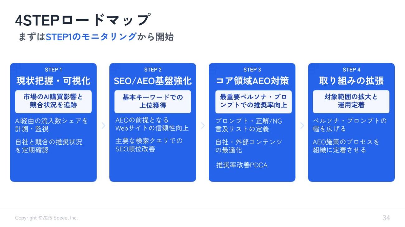 「今、全力でリソースを投じるべきは、短期的なROIのみを追求する施策ではありません。市場が本格化した際に先行者利益を独占するための『現状把握』と、既存施策とのシナジーを生む『効率的な投資』です。つまり、自社がAIにどう評価されているのかをモニタリングしたうえで、SEOとAEOの双方に効く施策から着手することが肝要です」(藤井氏)