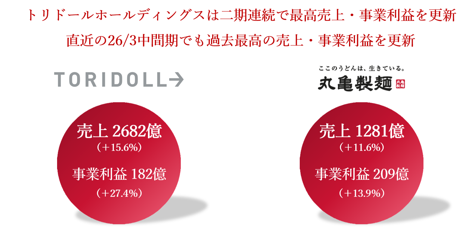 そんな中、「AIによる効率化」の真逆をいこうとしているのが、国内外で圧倒的な成長を続けるトリドールグループの丸亀製麺だ。トリドールホールディングスと丸亀製麺はともに二期連続で過去最高の売上・事業利益を更新している。