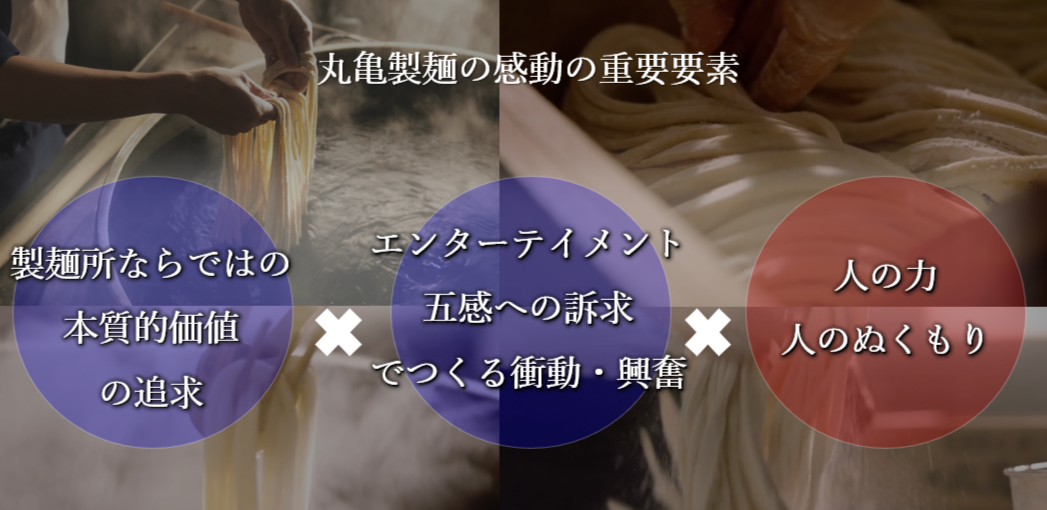 丸亀製麺が自社の独自価値、構造優位の源泉としているのは「感動(KANDO)」だ。同社では感動を「五感が揺さぶられ、本能が歓ぶ体験価値」と定義し、食のエンターテインメントを創ろうとしている。丸亀製麺が25年前に誕生した際も、「製麺所×セルフうどん」という、当時の日本にはなかった新しい体験価値を展開することで、独自の市場を切り拓いてきた。