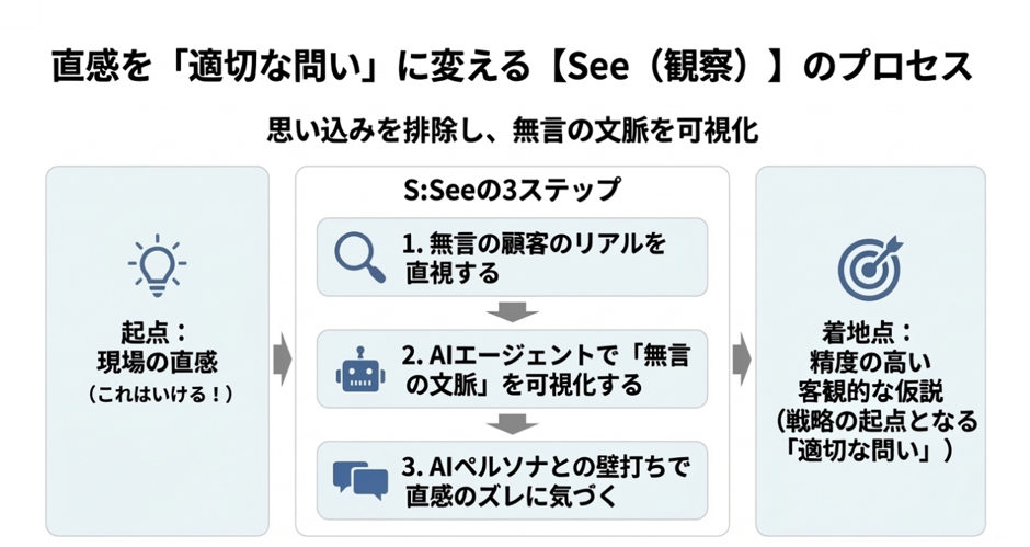 ここで1つ目の「S:See(観察)」の出番。AIを活用し、バイアスのない形で顧客のリアルを観察した上で、自分の中にある仮説に対して適切な問いを立てていきます。Seeのプロセスでは、以下3つのステップを踏みます。
