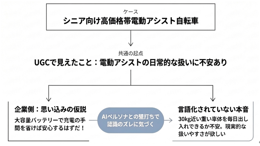 企業側が提供したい「スペック(パワー)による安心」と、顧客が直面する「30kg近い重い車体を日常で扱うことへの不安」。AIという鏡を通すことで、この認識のズレを客観的に捉えることができるのです。
