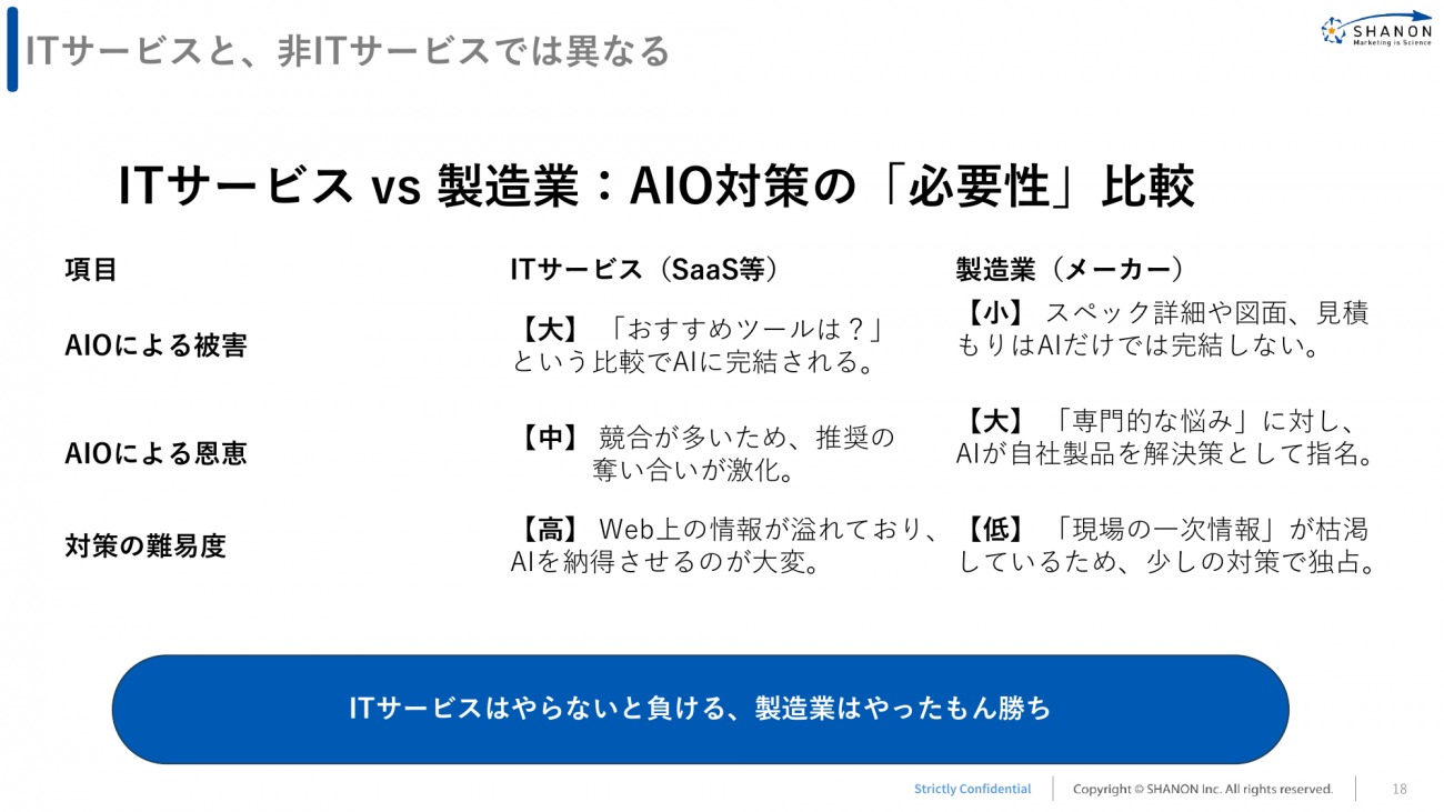 現時点ではAIO対応の必要性や難易度が、業界によって大きく異なると浅野氏は分析する。