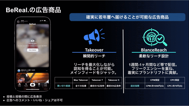もう1つのMAXテイクオーバーは、BeRealのメインフィードの広告枠を24時間ジャックできるメニューです。瞬間的にユーザーとの接触頻度を上げ、広告認知や利用意向を加速させることを得意としています。イベント開催やCMスタートのタイミングなどで利用していただくことが多いですね。