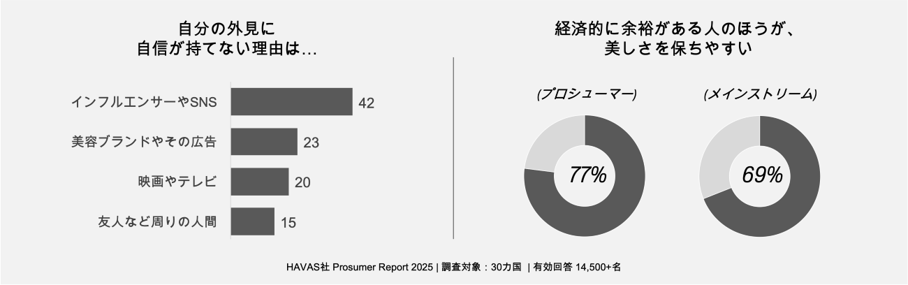 事実、調査では42%の人が、見た目への不安の要因として「インフルエンサーやSNS」を挙げています。SNSは理想的な姿を日常的に見せ続ける場であり、人との違いを意識させやすい環境でもあります。その結果、社会の中で共有される美のスタンダードは、以前よりも高くなりやすくなっています。