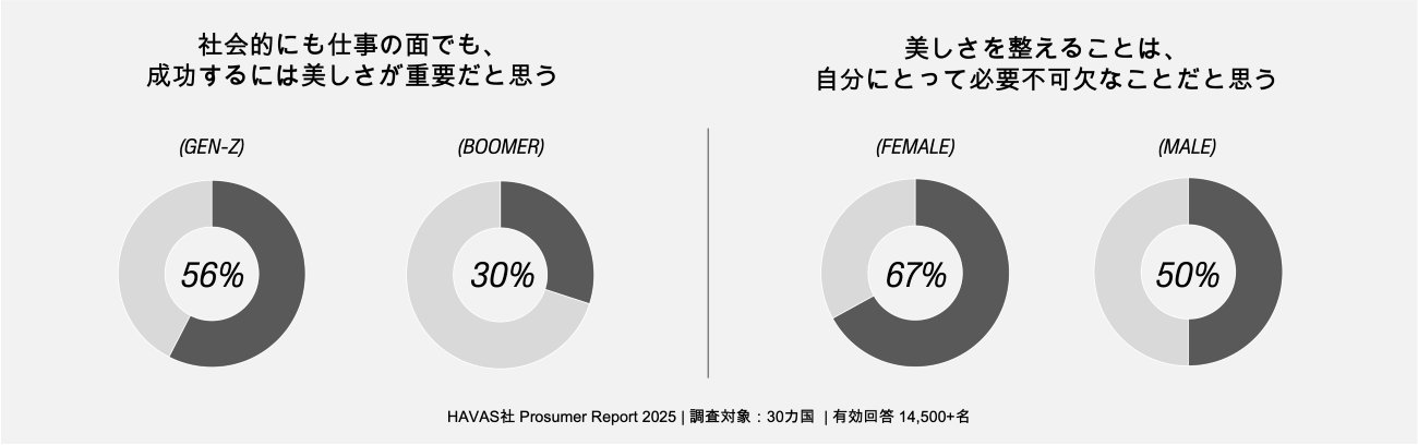 Havasの調査でも、多くのプロシューマーが「美しさは社会的・職業的成功に欠かせない」と考えています。なぜなら、整った外見は清潔感やきちんとした印象を与え、それが相手からの信頼や好意につながりやすいからです。つまり美しさは、単なる見た目の好みではなく、社会の中での評価にも影響するものになっているのです。調査結果にあるように、こうした「美が与える社会的信用」を背景に、今や男性の間でも美しさへの関心は急速に高まっており、ジェンダーを超えたテーマとなっています。
