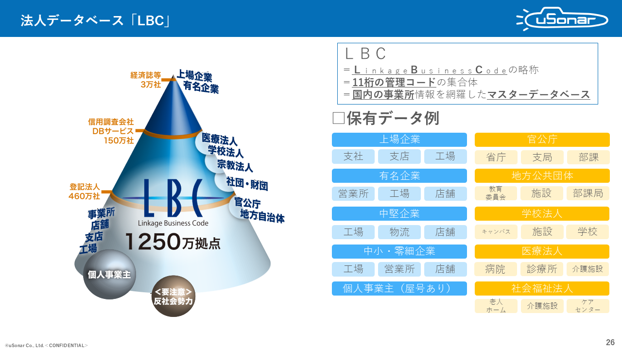 国内最大規模の法人データベース「LBC」を提供するユーソナー。同データベースは、企業の支社・店舗・工場まで網羅した1,250万拠点の情報を保有している。