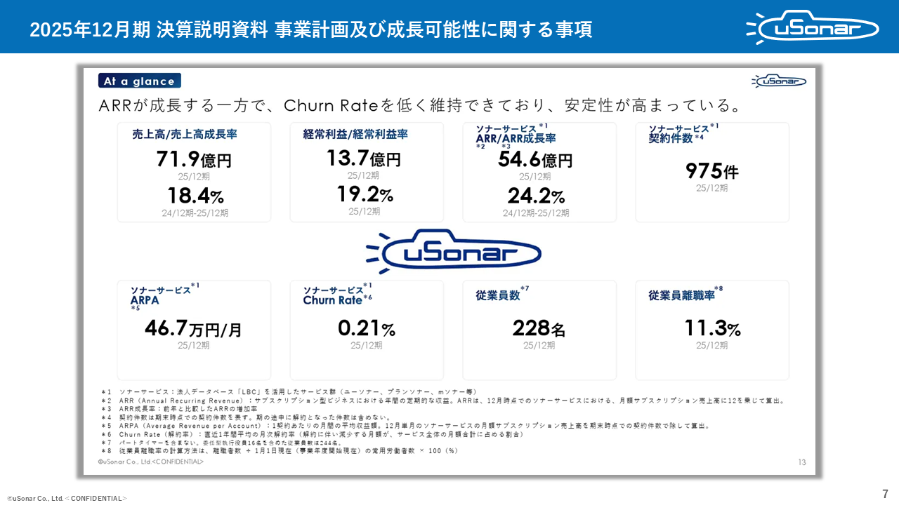 ユーソナーも、こうした現場と経営指標のズレを経験した。戸崎氏はユーソナーの決算説明資料を提示し、ユーソナーの経営層は売上高やARRに加え、チャーンレート(解約率)を重要な指標とみなしていると説明した。