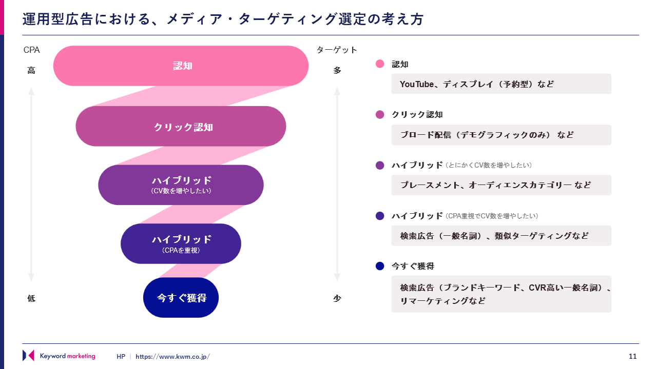 中でも注目すべきは、マーケティングファネルの最下層にあたる、コンバージョン直前の顕在層を対象とした「今すぐ獲得」ゾーンだ。この段階にいるユーザーは、キーワードやブランド名・会社名で検索するため、購買などの意向・意欲が高い。 比較的CPAが低く抑えられ、効率的なコンバージョン獲得が期待できるが、その一方で、母数が限定的で、対象キーワードも多くはないため過密化する傾向にある。
