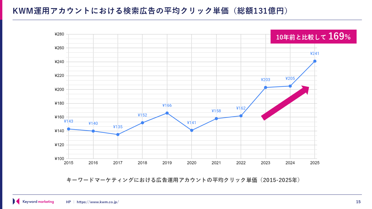 また、キーワードマーケティングで運用した検索広告のデータを見ると、平均クリック単価は右肩上がりの上昇を続け、10年前比で169%に達している。