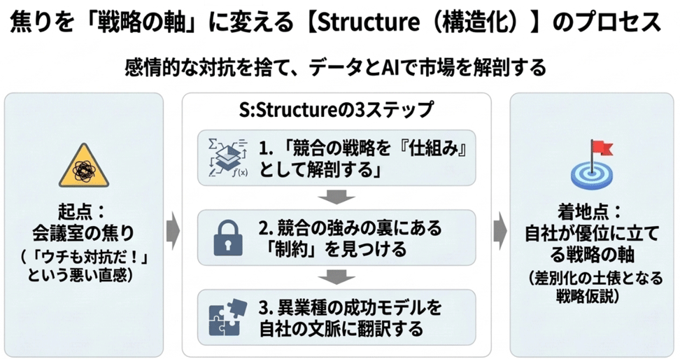 AIは公開情報や多様なテキストデータをもとに、見落としやすい「仕組みの側面」を整理してくれます。競合の強みを表層的な事象としてではなく「構造」として理解することが、このステップの目的です。