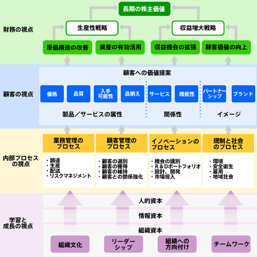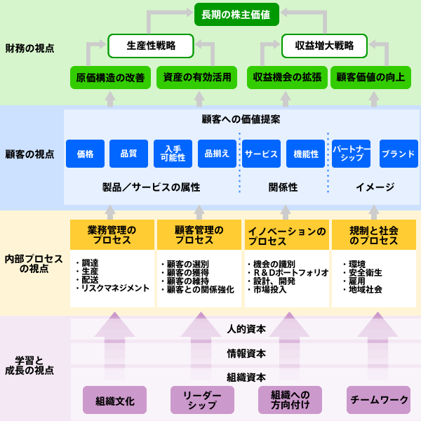「バランスト・スコアカード」の開発者であるロバート・S・キャプランとデビッド・P・ノートンは著書『戦略マップ~バランスト・スコアカードの新・戦略実行フレームワーク~』の中で「測定できないものは管理できない。記述できないものは測定できない」と述べています。そして、企業戦略の可視化を実現するためのフレームワークとして、以下のような「戦略マップ」を提案しています。