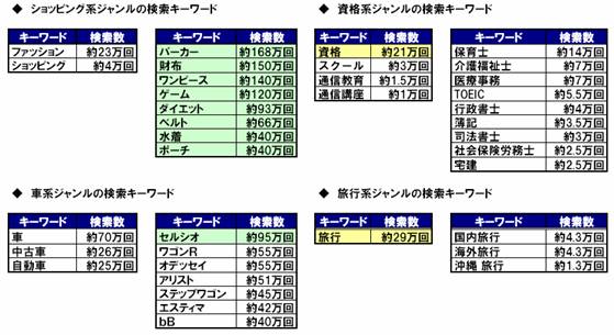 緑地の部分は、ジャンルキーワードよりも検索数が多い具体名称キーワードを示し、黄色地はジャンルキーワードの方が、具体名称キーワードよりも検索数が多かったのではないかと推測できる。すなわち、着うた系とショッピング系、車系ジャンルにおいては具体名称キーワードが、資格系ジャンルと旅行系ジャンルにおいては広域なジャンルキーワードが多いことが分かる。