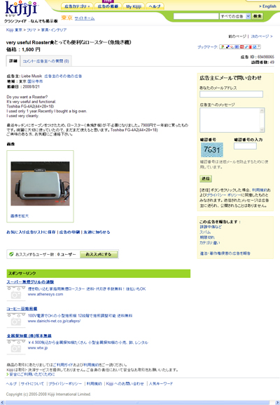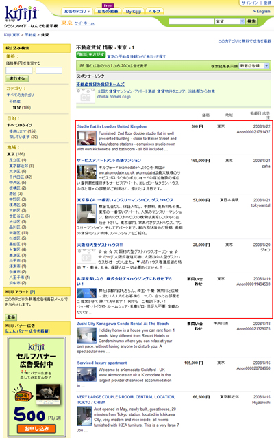 1つは、下記のようにkijiji内の各ページに挿入されたPPC広告/純広による広告収益モデルである。Webでサービスを展開すれば、PPC広告の利用は必然なので、広告収益モデルがkijijiで活用されていることは何も驚く事はない。