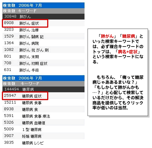 「糖尿病」というキーワードは月間検索数が15万件以上にもなるビッグキーワードは、ほとんどの場合「もしかして俺ってやばいんじゃあ? 糖尿病ってどんな症状が出るんだろう?」と心配しているだけだ。すでに病気になっている人の方が少ないので、糖尿病を改善する商品やサービスを告知してもクリック率が低くなるのは当然、ということになる。つまり、冒頭の相談者の質問は、「悩み自体が間違っている」わけだ。
