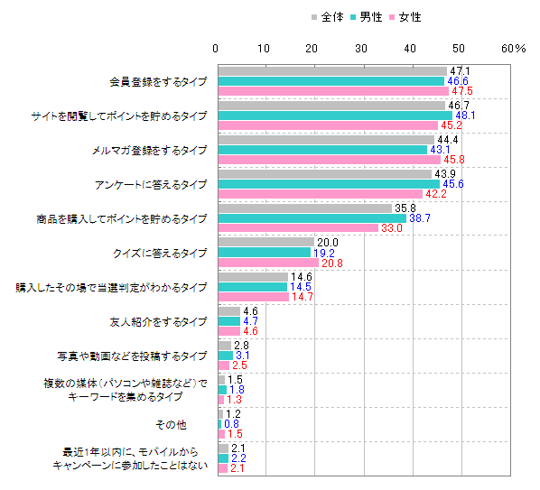 最近1年間のうち参加したモバイルキャンペーンのタイプについて尋ねたところ、「会員登録をするタイプ」(47%)が最も高く、次いで「サイトを閲覧してポイントを貯めるタイプ」(47%)、「メルマガ登録をするタイプ」(44%)となり、男女間での大きな差は見られませんでした。