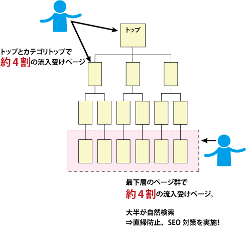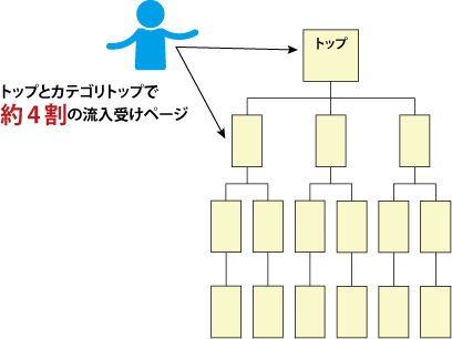 このサイトもご多分に漏れず、主要な入り口ページはトップページ、主要商材を紹介するカテゴリトップでした。この2つのページが、このサイトへの入り口となっていた割合は、サイト全体の約4割に達します。言い方を変えると、残りの6割は別のページが入り口となっていたのです。
