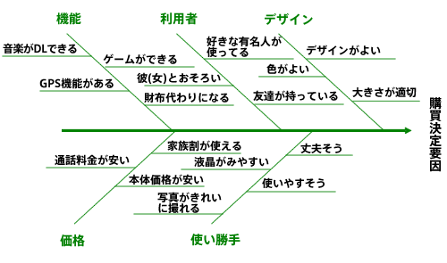 例えば、データから読み取れる様々な要因を整理するには、「親和図」や下図のような「特性要因図(フィッシュボーンダイアグラム)」などがありますし、判明した複数の要因のどれから改善するかを決めるために優先順位をつける判断を行う場合には、「パレート図」や「品質機能展開(QFD)」などのツールも用意されています。