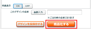 実際に商品として販売する場合には、商品作成ツールの右下にある「このデザインの名前」の部分に、当該商品の名称を入力し、更に下部にある【商品化する】ボタンをクリックします。この作業をもって、商品の商品化登録が完了となります。